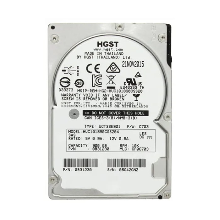 Основні характеристики Жорсткий диск HGST Ultrastar C10K1800 900Gb 10000 об/хв SAS 12 Gbit/s (HUC101890CSS204)