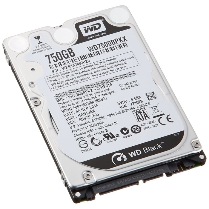 Western Digital Black 750GB 7200 об/хв 6 Gbit/s 2.5 (WD7500BPKX) – це продуктивний жорсткий диск серії Black, розроблений для користувачів, яким важлива швидкість, надійність та стабільність роботи системи. Дана модель поєднує компактний форм-фактор 2.5" з високою швидкістю обертання шпинделя, що робить її відмінним рішенням для ноутбуків, мобільних робочих станцій та компактних ПК.