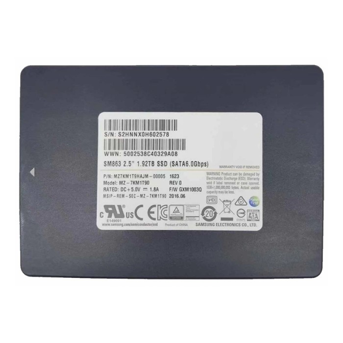 Samsung SM863 1.92TB — це надійний корпоративний SSD-диск формату 2.5" з інтерфейсом SATA 6 Гбіт/с, розроблений спеціально для серверів, дата-центрів і критично важливих систем. Завдяки високій швидкості читання та запису, а також великому ресурсу перезапису, цей накопичувач ідеально підходить для інтенсивного навантаження в середовищі 24/7.