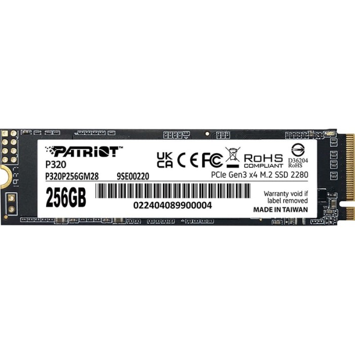 Patriot P320 256GB NVMe M.2 Gen3x4 (P320P256GM28) — це сучасний твердотільний накопичувач, який забезпечує відмінне поєднання швидкості, надійності та енергоефективності. Він ідеально підходить для оновлення настільних комп’ютерів або ноутбуків, забезпечуючи швидке завантаження операційної системи, програм і файлів.