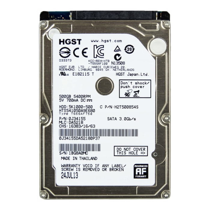 Основные характеристики Жесткий диск HGST Travelstar 5K1000 500Gb 5400 об/мин 3 Gbit/s (HTS541050A9E680)