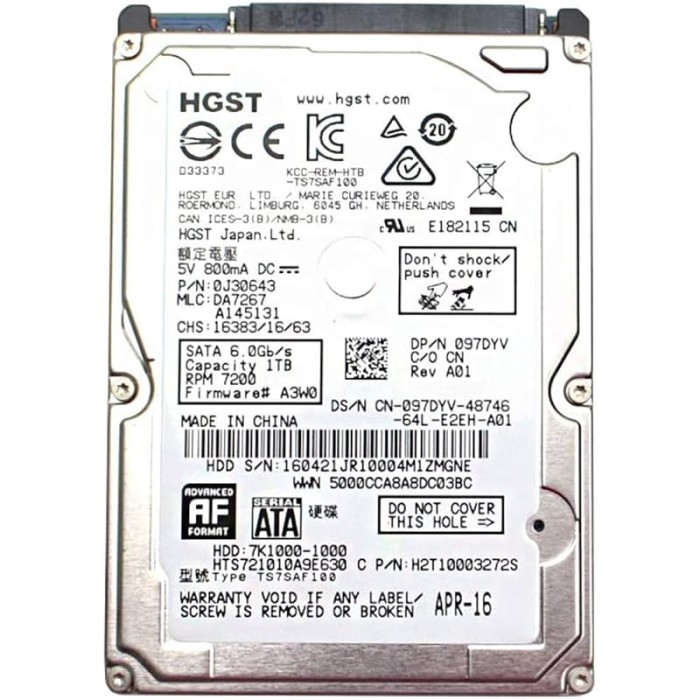 Основные характеристики Жесткий диск HGST Travelstar 7K1000 1Tb 7200 об/мин 6 Gbit/s (HTS721010A9E630)