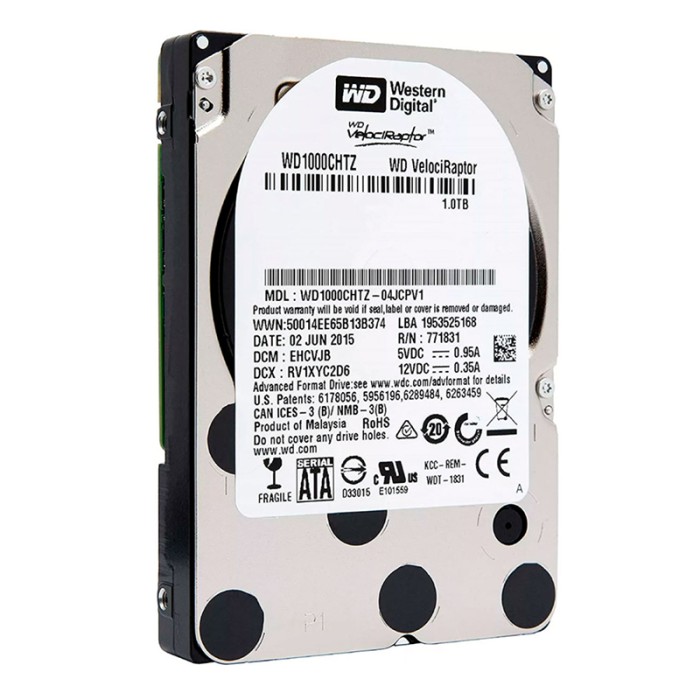 Western Digital VelociRaptor 1Tb 10K SATA 6Gb/s (WD1000CHTZ) – высокопроизводительный жёсткий диск корпоративного класса со скоростью вращения шпинделя 10 000 об/мин, предназначенный для серверов и рабочих станций, где требуется максимальная производительность HDD.