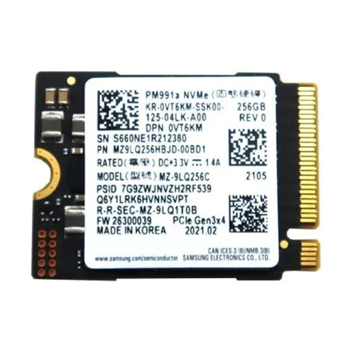 Samsung PM991a (модель MZ-9LQ256C / MZ9LQ256HBJD) — это высокоскоростной твердотельный накопитель объёмом 256 ГБ в компактном форм-факторе M.2 2230, идеально подходящий для ультрабуков, мини-ПК и встраиваемых систем. Благодаря интерфейсу PCIe Gen3 x4 и протоколу NVMe 1.4, накопитель обеспечивает молниеносную передачу данных и энергоэффективную работу.