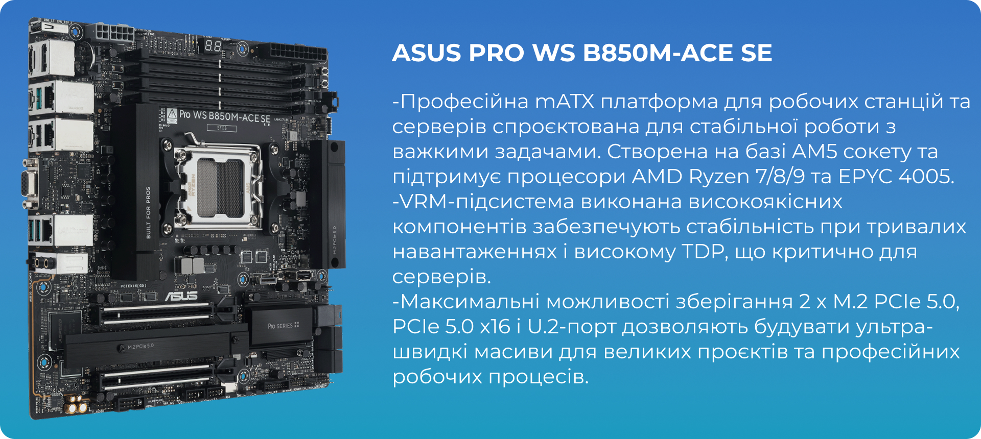 - Професійна материнська плата ASUS Pro WS B850M-ACE SE.